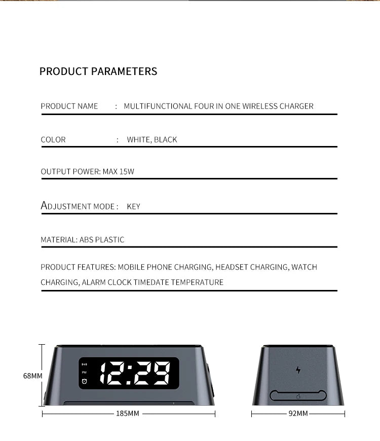 🔋【4-in-1 Fast Wireless Charging Station】Apple Charging Station - Unique 4-in-1 design, the wireless charging station can not only charge your iPhone or wireless charging-enabled mobile phone, watch, AirPods and other mobile phones at the same time - up fast with maximum power charges to 18W, wireless charging station with clock, but it also has a digital alarm clock, a nice nightstand or desk companion. A high quality QC 3.0 power adapter (9V/2A) is recommended.